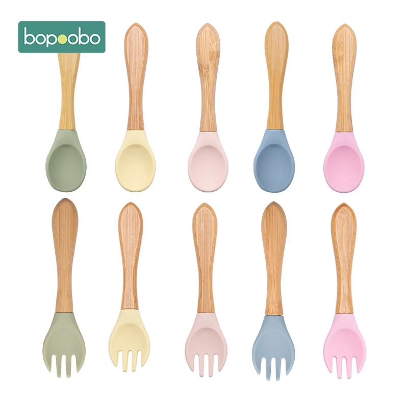 Name: Bopoobo-tenedor de bambú para bebé, cuchara de alimentación de bebé de madera de silicona, accesorios de alimentación para niños pequeños, grado alimenticio orgánico sin BPA, 2 uds.